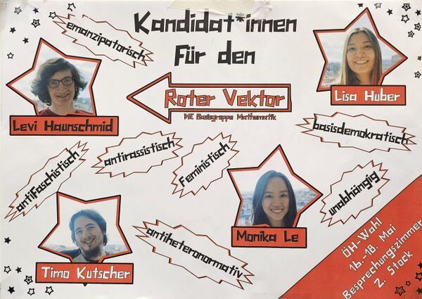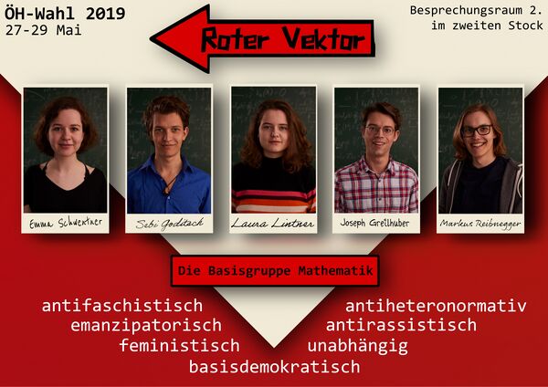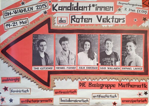Da der Rote Vektor eine Basisgruppe ist, versuchen wir alle Aufgaben so gut wie möglich zu verteilen, um Hierarchien zu vermeiden. So können auch Nicht-Mandatar*innen sich in fast allen Bereichen einbringen. Die Studienvertretung fungiert allerdings nach außen hin meistens als Anlaufstelle, sowohl für Studierende, als auch für Professor*innen. Die Mandatar*innen, die zeichnungsberechtigt sind, können zusätzlich Formulare bzw. Ausgabenrefundierungen unterzeichnen.