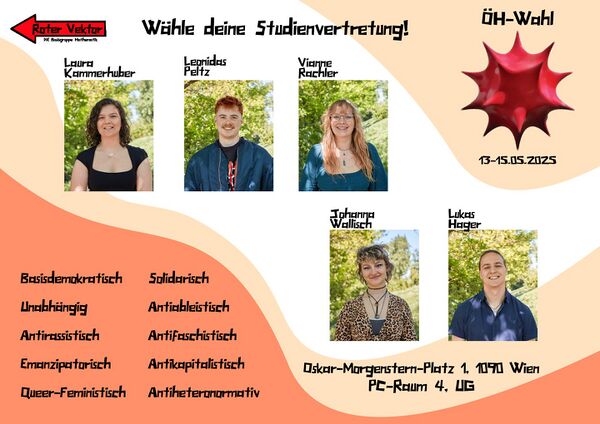 Die Studienvertretung setzt sich aus 5 Personen zusammen, die alle 4 Semester bei den ÖH-Wahlen im Mai gewählt werden. Die letzten Jahre haben sich selten bis nie Menschen außerhalb des Roten Vektors zur Wahl stellen lassen. Wir versuchen immer im Plenum konsensuell 5 Leute zu bestimmen, die dann geschlossen für den Vektor bei der Wahl antreten. Von den 5 Mandatar*innen ist eine Person Vorsitzende*r und zwei weitere sind ebenfalls zeichnungsberechtigt.